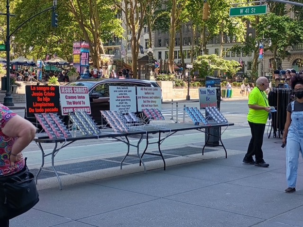 Brian developed a method of placing strategically designed tables fitted with 21-pocket Chick tract racks, each holding 525 tracts, at high-traffic intersections all throughout NYC. In 2022, God provided a Manhattan storefront church—King James Bible Baptist Church—allowing him to expand the ministry with greater organization. Inside, he stores and categorizes tracts and King James Bibles in hundreds of languages. His goal is to have tracts on hand for every neighborhood, language, people group, and religion in the boroughs of NYC.