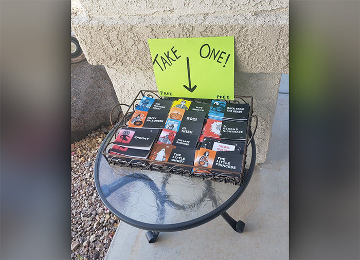 We’ve heard kids coming down the block saying, “This is the house where we get those little books we like!” They reach for the Bibles and tracts first. Some get so excited they ignore the candy! One little girl held the Bible close to her chest and said, “You mean I can have my very own Bible?”